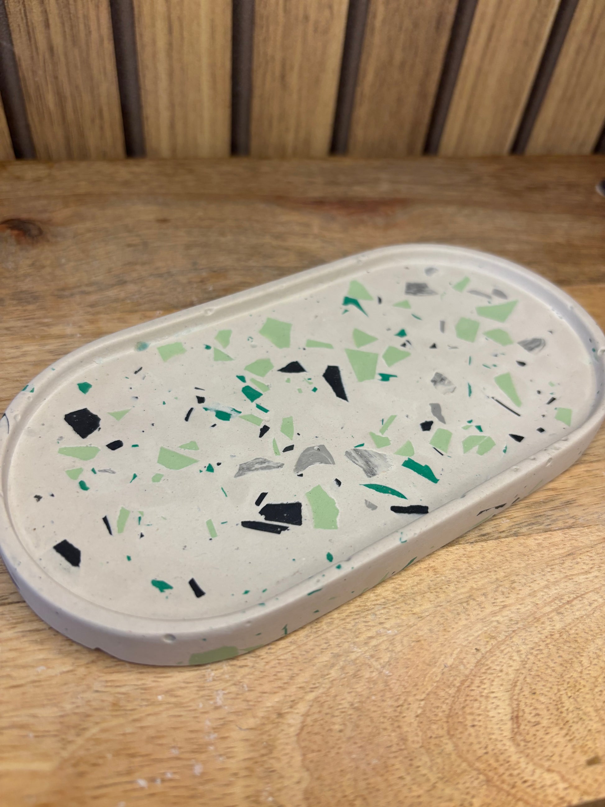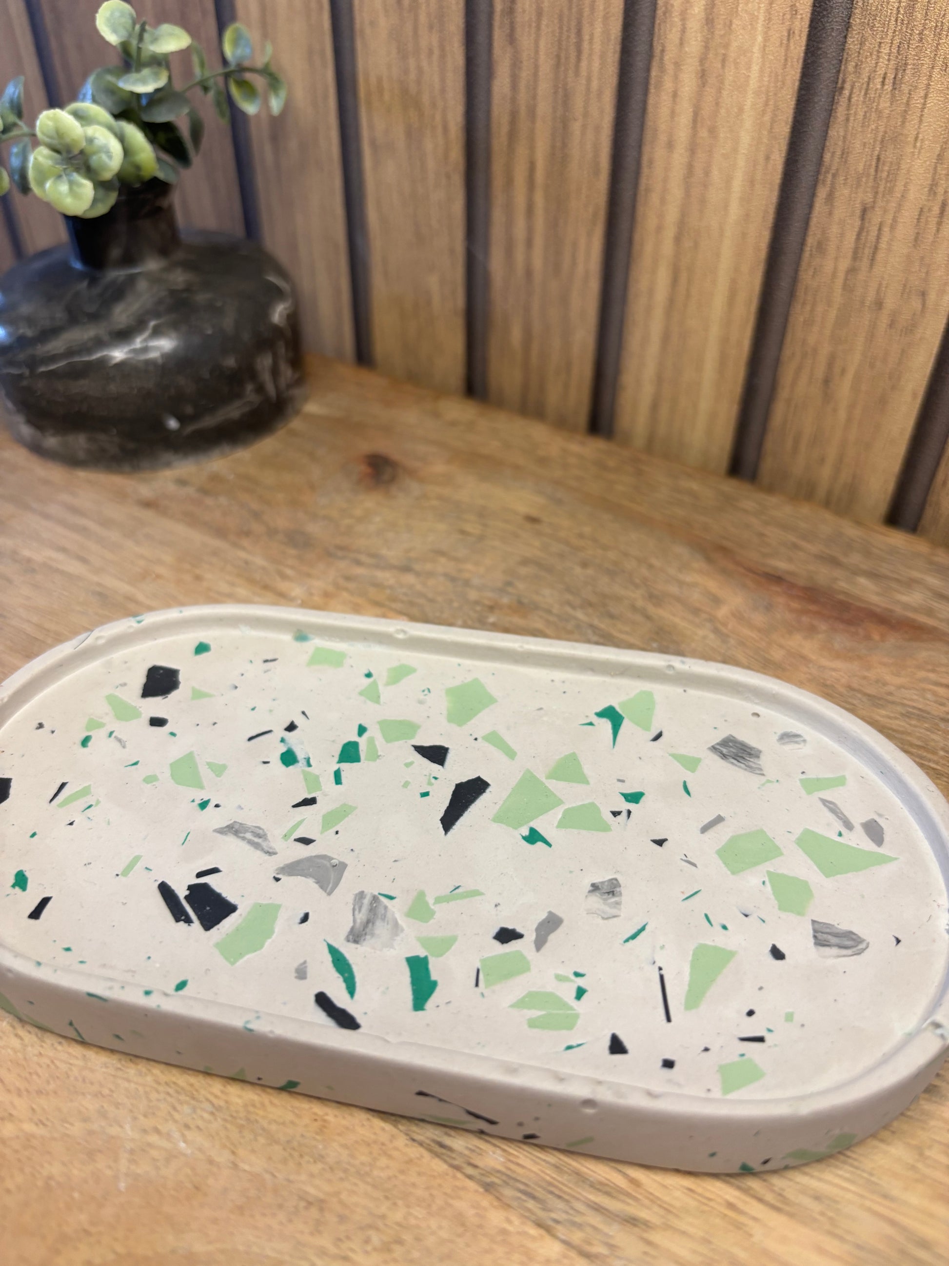 Cet élégant vide poche ovale effet Terrazzo est un plateau fabriqué à la main.